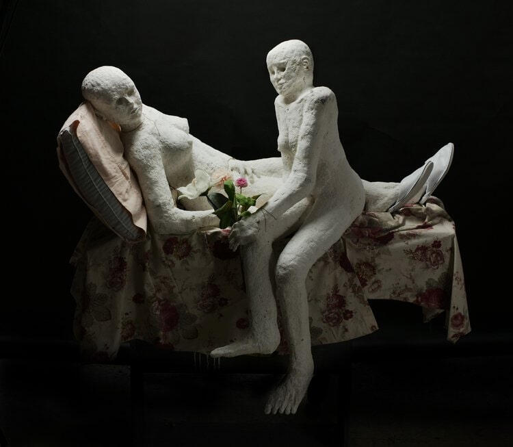 acrylic paint on canvas, wire, wire mesh, plaster mold, fabric, paper-mache