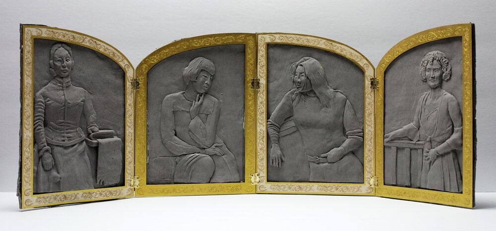 Clay, laser-printed wooden frame made on Adobe Illustrator, gold paint