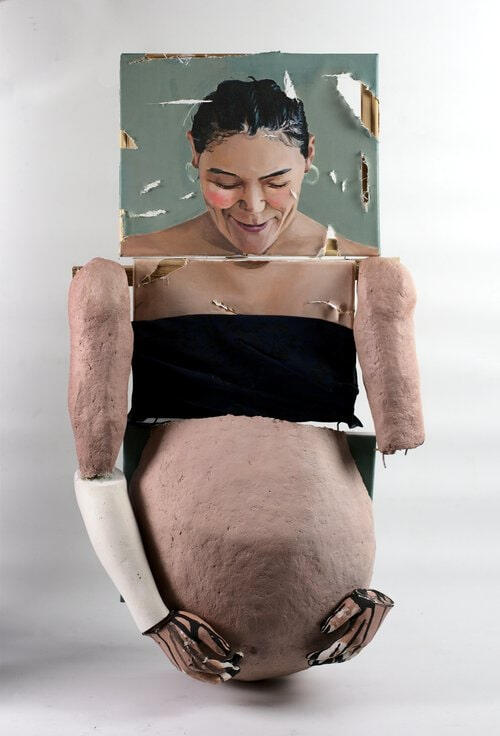 acrylic paint on canvas, wire, wire mesh, plaster mold, fabric, paper-mache