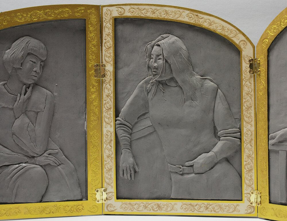 Clay, laser-printed wooden frame made on Adobe Illustrator, gold paint