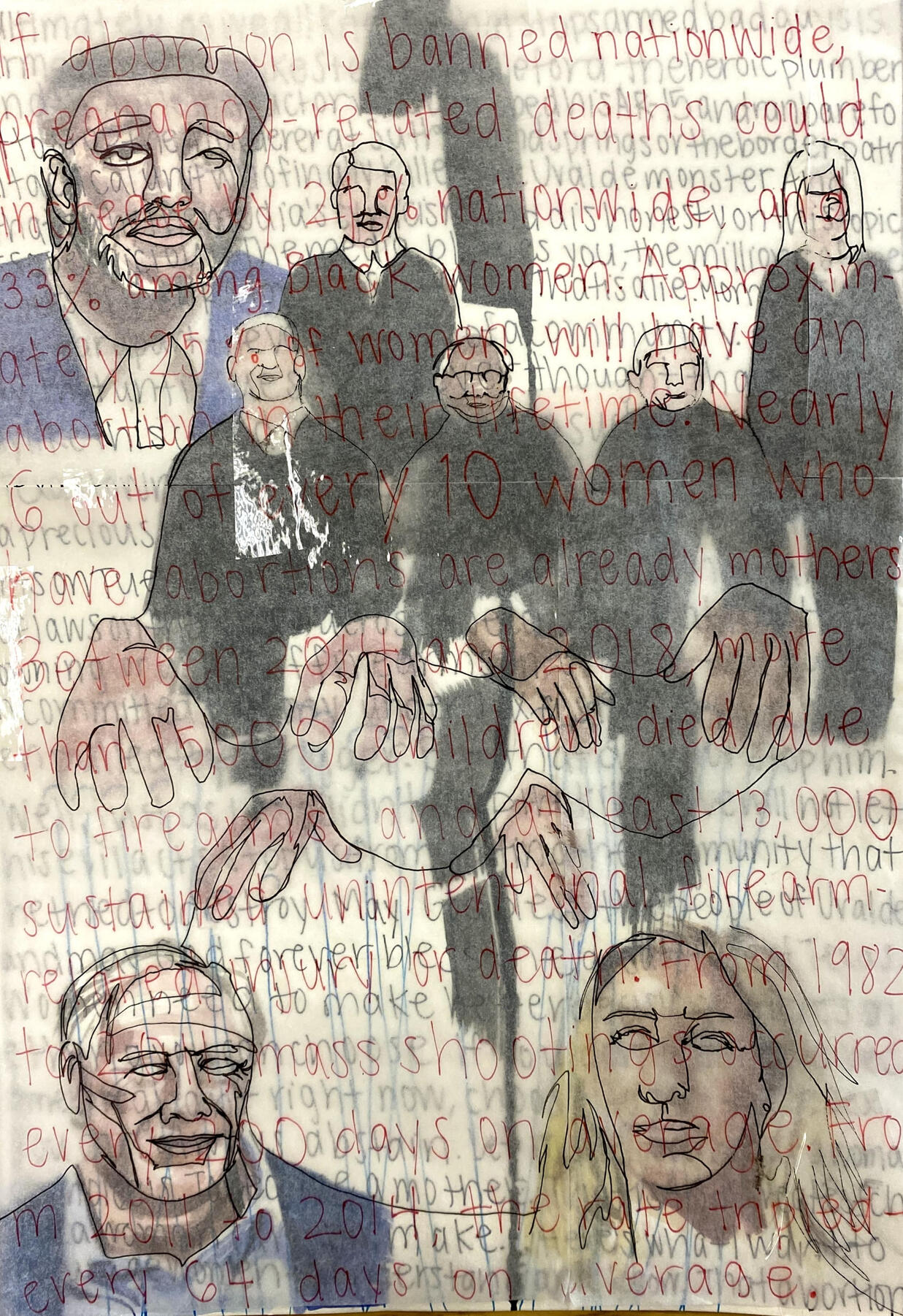 I’m interested in how language functions as a vehicle of oppression and contradicts reality. Though America claims to be a beacon of democracy, its history proves otherwise. Last June, five people who were not democratically elected determined that women could no longer make decisions about their own bodies. I inquired how language wielded by people in positions of power affects women and people capable of pregnancy, especially those at the intersection of marginalized identities. Drawing inspiration from Isabel Wilkerson, David Wojnarowicz, and Barbara Kruger, I dissect the implications of the Dobbs v. Jackson Women's Health Organization case and Trump’s “Lock her up!” chant.
